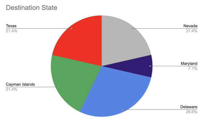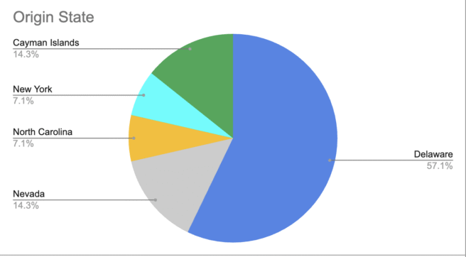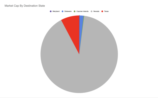 We also put together a basic pie chart to show market cap by jurisdiction. The big driver for Nevada’s market cap position is Datadog with its roughly $44 billion market cap.