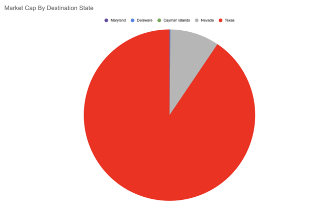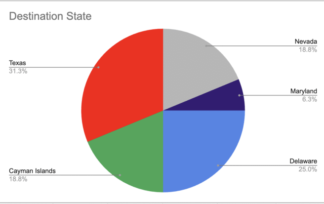 Picking back up after February’s post, I’ve got an updated list looking at movement between states so far this year in preparation for a panel at KPMG’s Board Leadership Conference this week. This list has grown with another five companies announcing attempts to shift their incorporation jurisdiction since the last update. Some thoughts on the announced moves after the list as well, infographics, and quick note about my new Senior Of Counsel role.