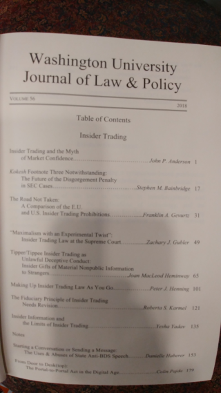 Great reading on this topic, all around. As we await the next insider trading regulation volley after Salman v. United States, this collection of essays and articles fills a nice gap. Although the issue is not yet posted to the journal’s website, it soon should be. In the mean time, here is a photo of the relevant page from the table of contents: