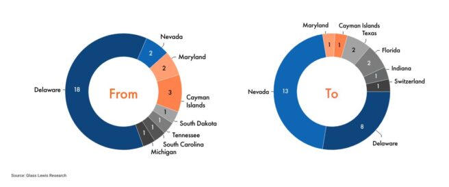 - Nevada surpassed Delaware as a reincorporation destination with 13 firms announcing for Nevada and 8 for Delaware.